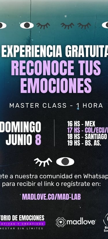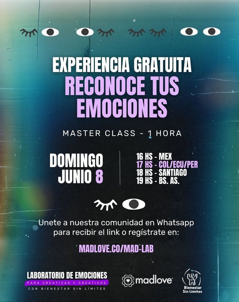 Un espacio seguro para conectar, crear, sentir y encontrar nuevas formas de habitar tu creatividad. MadLove y Bienestar Sin Límites te invitan a esta experiencia gratuita donde podrás acercarte a tus emociones y descubrir herramientas para acompañar tu camino creativo desde el bienestar y la consciencia. 🗓 Domingo 8 de junio⏰ 16h 🇲🇽 | 17h 🇨🇴 🇪🇨 🇵🇪 | 18h 🇨🇱 | 19h 🇦🇷 📍 Evento online por Zoom : Recibe link y materiales en nuestra comunidad de Whatsapp 🎟 ¡Cupos limitados!
