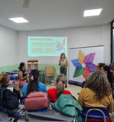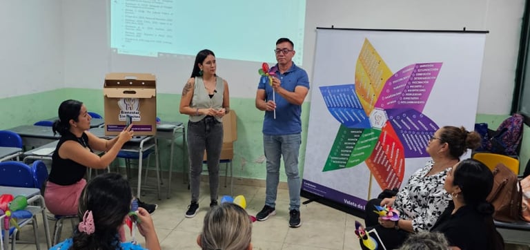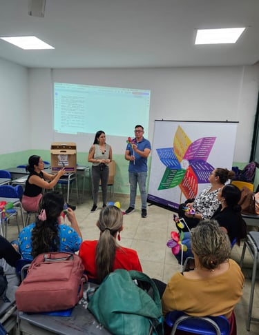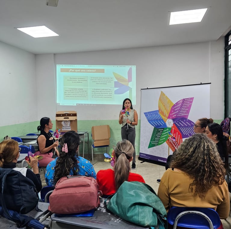 Implementación integral del Kit Emociones en Movimiento, que incluye la veleta institucional, veletas pequeñas, ruletas y una guía con más de 100 actividades organizadas por competencias emocionales y ciclos vitales (primaria, bachillerato y adultos). Los docentes y orientador participaron en una capacitación práctica para integrar el kit al aula, fortaleciendo el vocabulario emocional, la autorregulación y la convivencia escolar.