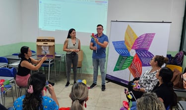 Implementación integral del Kit Emociones en Movimiento, que incluye la veleta institucional, veletas pequeñas, ruletas y una guía con más de 100 actividades organizadas por competencias emocionales y ciclos vitales (primaria, bachillerato y adultos). Los docentes y orientador participaron en una capacitación práctica para integrar el kit al aula, fortaleciendo el vocabulario emocional, la autorregulación y la convivencia escolar.
